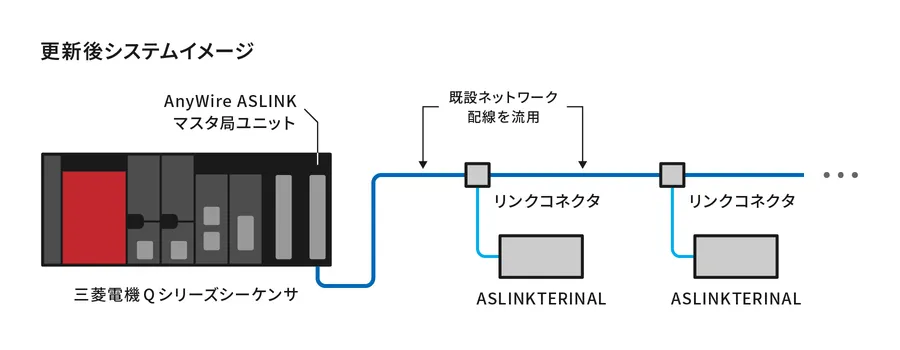 配線の引き直しをした場合工期が長くなりコストも増えるため、エニイワイヤ社製AnyWireASLINKを導入いたしました。